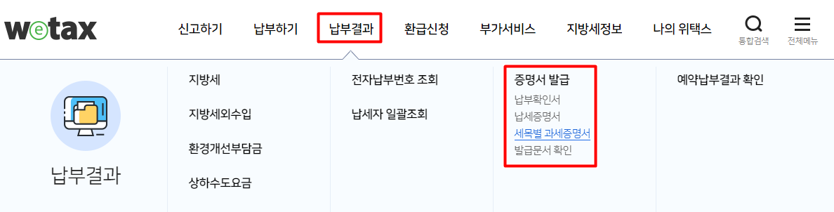 로그인을 하셨다면 아래 카테고리로 들어가 주세요. 상단의 납부결과에 마우스를 올려두시고 우측에 증명서 발급란에 세목별 과세증명서를 클릭해 주세요.
